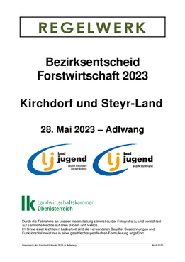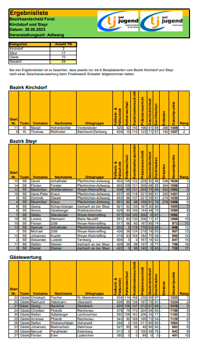 Am Pfingstsonntag, 28. Mai wurde der Bezirksentscheid Forst von der Landjugend Pfarrkirchen-Adlwang im Zuge ihres 41-jährigen Jubiläumsfestes ausgetragen. Der Bezirk Steyr-Land ging mit 18 Teilnehmern an den Start, der Bezirk Kirchdorf mit zwei. In der Gästewertung haben 10 Landjugendliche ihr Können unter Beweis gestellt.